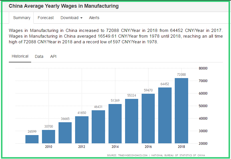 Wages in Manufacturing in China increased to 72088 CNY/Year in 2018 from 64452 CNY/Year in 2017. Wages in Manufacturing in China averaged 16549.61 CNY/Year from 1978 until 2018, reaching an all time high of 72088 CNY/Year in 2018 and a record low of 597 CNY/Year in 1978.