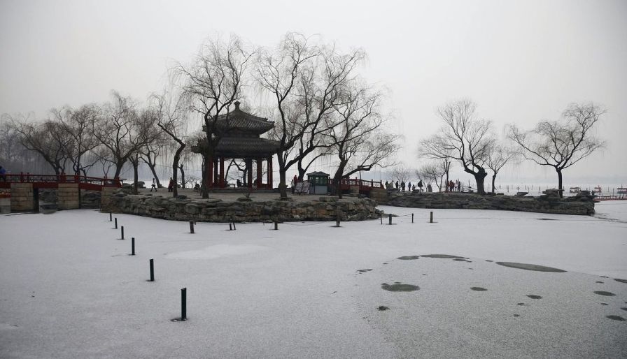 北京迎来今冬首场雪。图为颐和园内雪景。