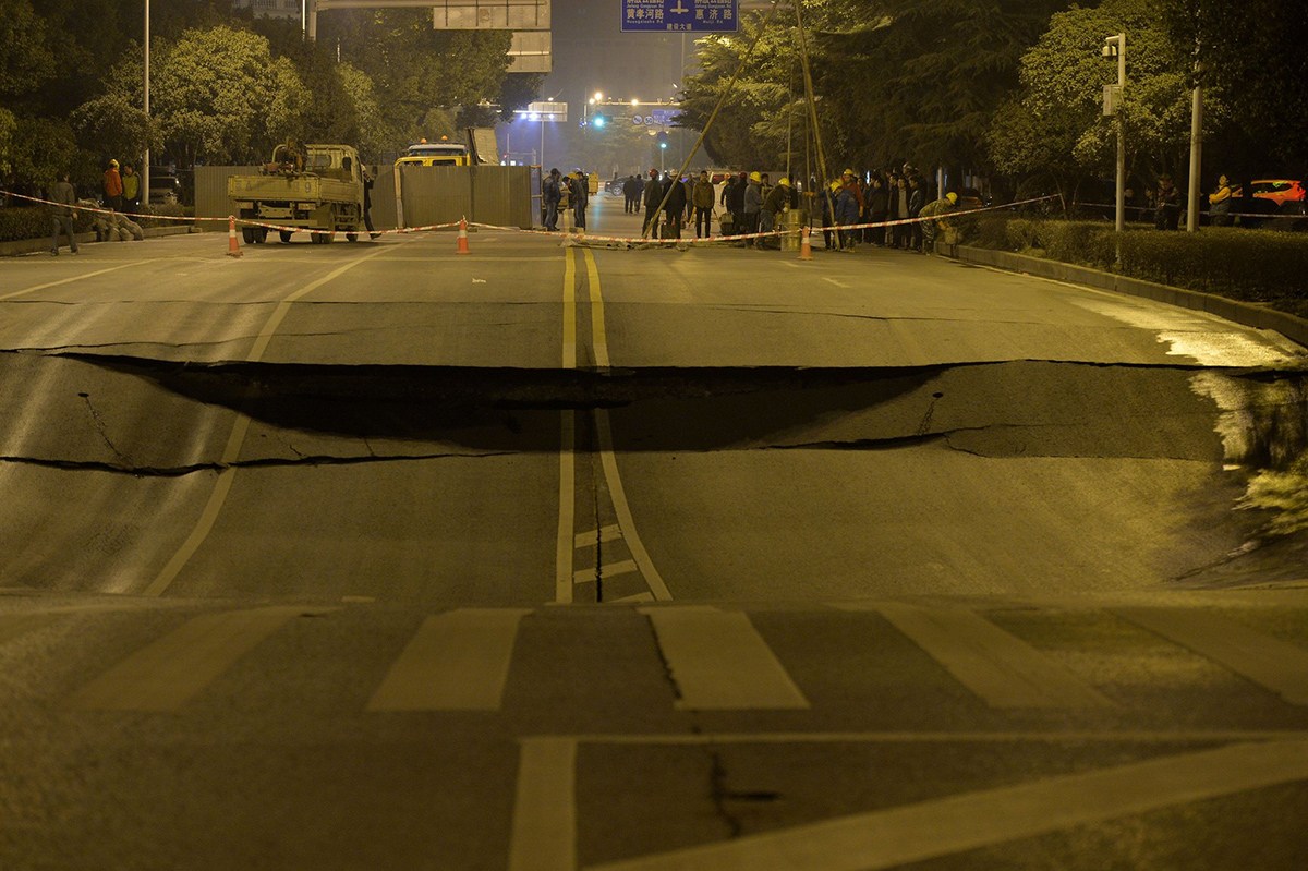 2月10日晚上7时06分,汉口建设大道和黄孝河路交会处双向四车道路面发生塌陷,现场如同一口大锅嵌在地上。